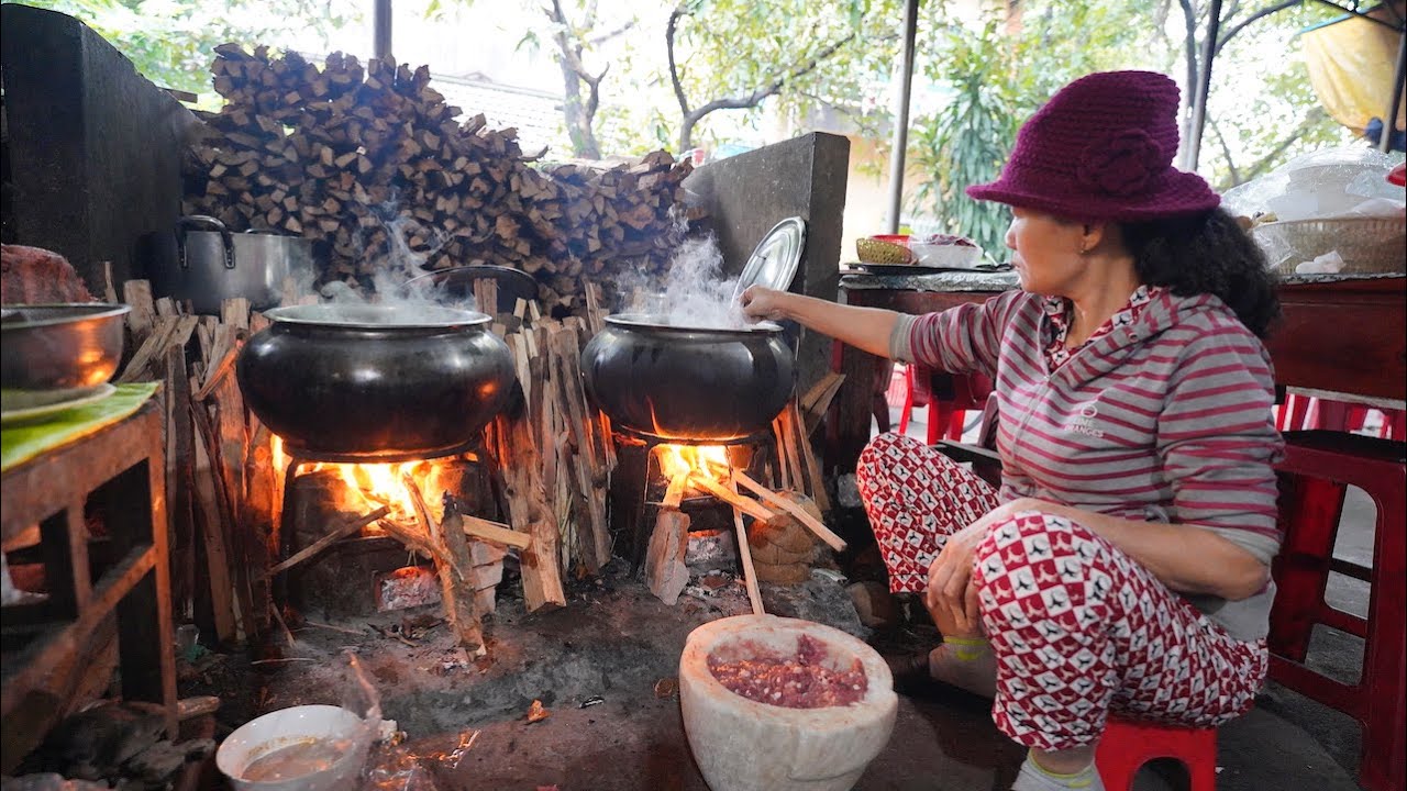 Mỗi sáng, chủ quán sẽ tự tay lựa chọn từng phần thịt bọ, xương bò, chân giò lợn từ các lò mổ để đảm bảo chất lượng nhất cho nồi nước nước dùng. Nước dùng được ninh từ xương bò và xương lợn trong nhiều giờ liền trên chiếc bếp củi hoài niệm.