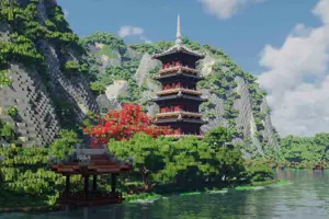 Đặc biệt, biểu tượng rồng đá trên đỉnh núi Múa được tái hiện với độ chính xác kinh ngạc, tạo nên một hiệu ứng chiều sâu ấn tượng khi quan sát từ trên cao. Cách dàn dựng bối cảnh công phu này đã biến tác phẩm trong Minecraft thành một tour du lịch thực tế ảo đẳng cấp, phô diễn trọn vẹn sự hùng vĩ của thiên nhiên Ninh Bình.